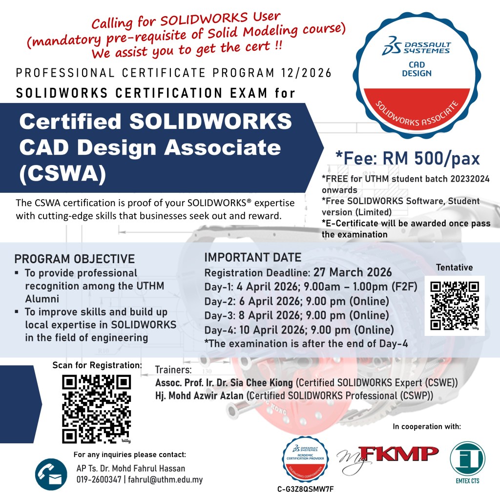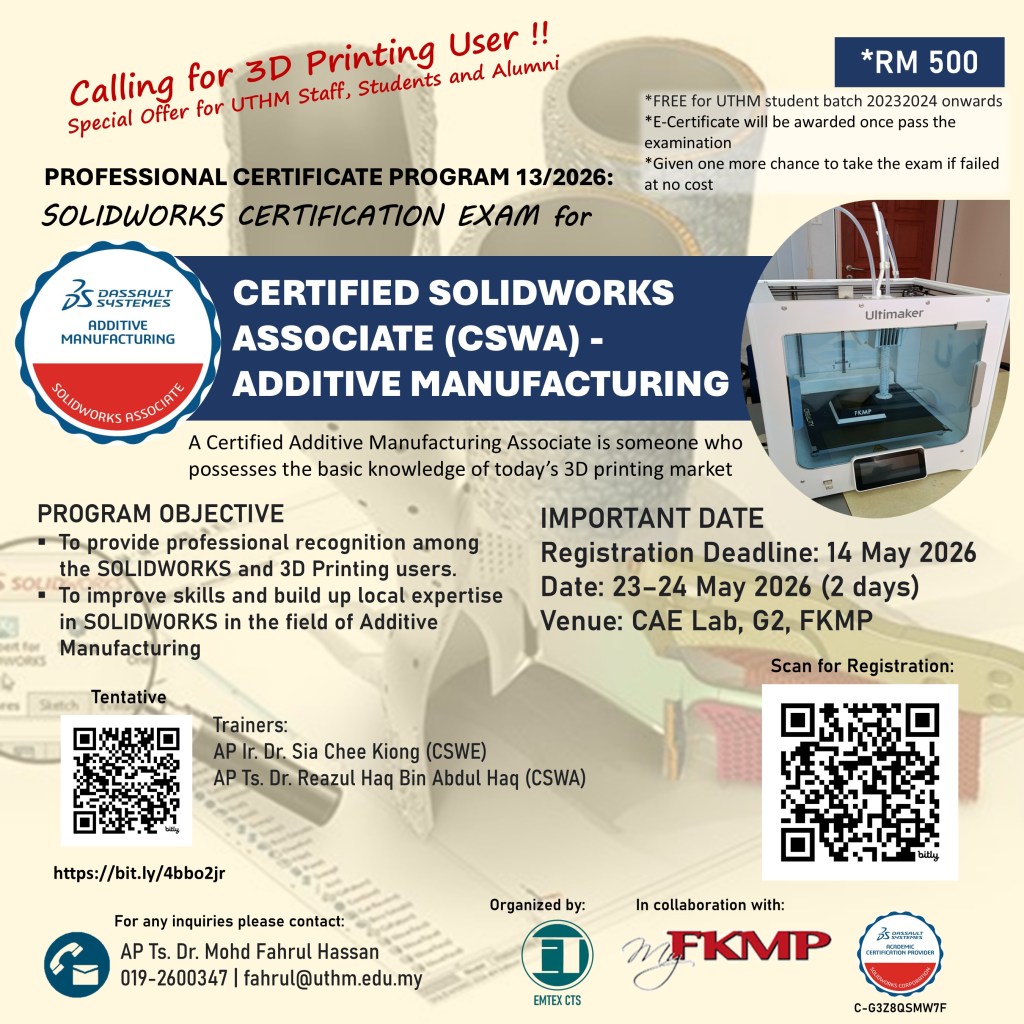 Venue: CAE Laboratory, Blok G2, Kompleks FKMP, UTHM