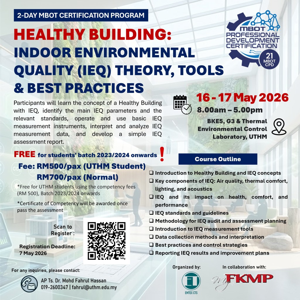 Participants will learn the concept of a Healthy Building with IEQ, identify the main IEQ parameters and the relevant standards, operate and use basic IEQ measurement instruments, interpret and analyze IEQ measurement data, and develop a simple IEQ assessment report.
